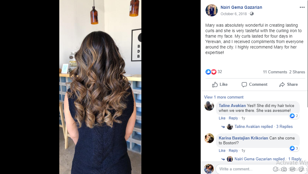 “Mary was absolutely wonderful in creating lasting curls and she is very tasteful with the curling iron to frame my face. My curls lasted for four days in Yerevan, and I received compliments from everyone around the city. I highly recommend Mary for her expertise!”